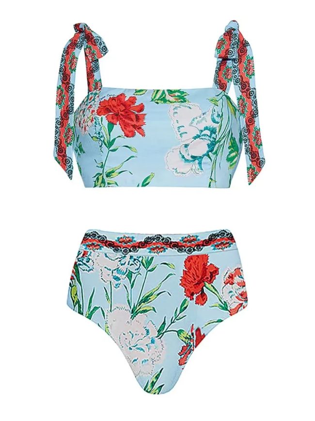 A soft floral bikini with tie-shoulder details and a flattering high-waist bottom.