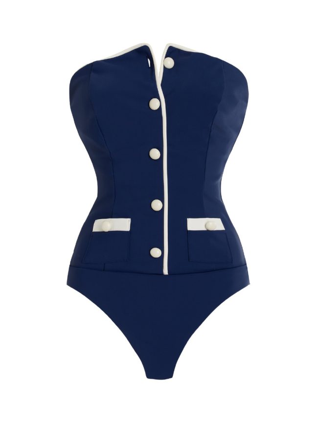 A structured navy one-piece with tailored buttons, paired with matching high-waist shorts for polished resort style.