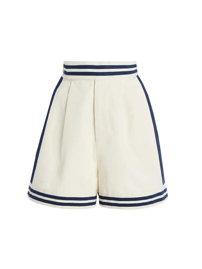 A refined nautical bikini set paired with tailored high-waist shorts for a chic retro-seaside look.