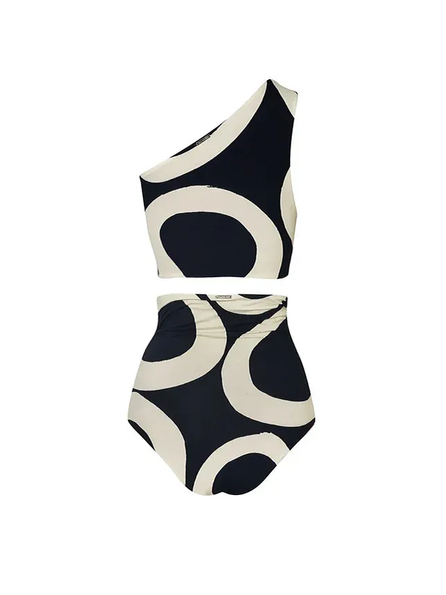 Black and ivory graphic two-piece featuring an asymmetrical one-shoulder top and high-waisted bottom. Bold, sculptural, and effortlessly modern.
