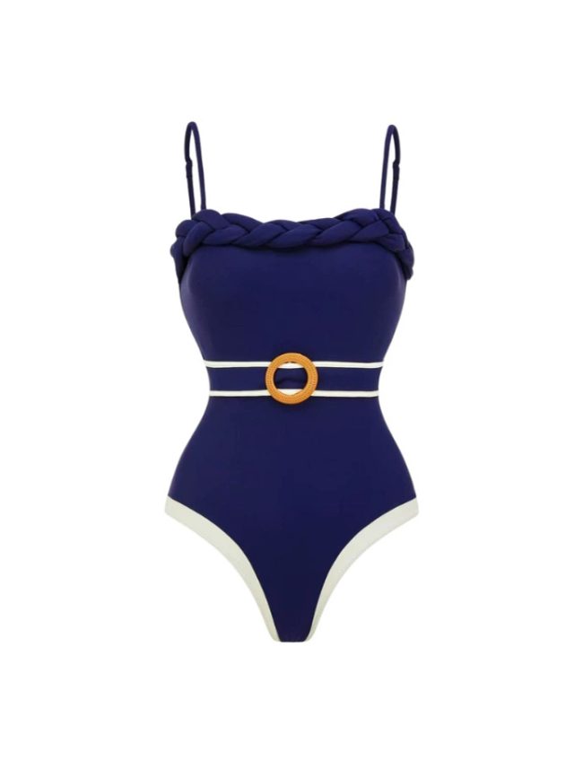 Sophisticated navy one-piece swimsuit featuring a braided neckline and a sculpted waist belt with a gold ring detail, paired with a bold striped wrap skirt for a refined resort look.