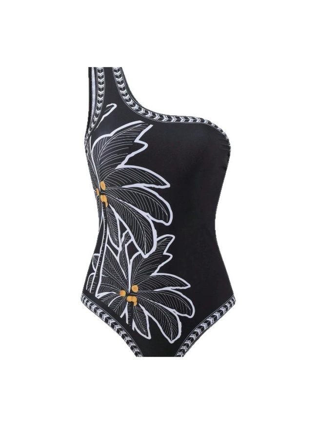 Elegant one-shoulder floral swimsuit paired with a lightweight wrap sarong for a sophisticated monochrome resort look.