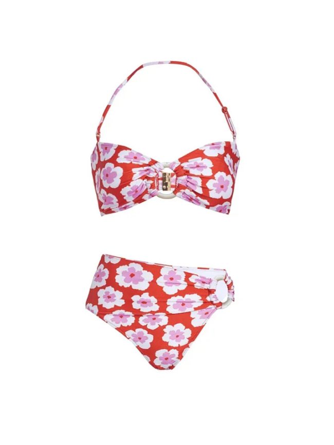 A lightweight resort set featuring a bandeau bikini top paired with flowing tropical-print pants for effortless beach elegance.