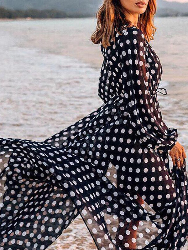 A bold black one-piece swimsuit paired with a sheer polka-dot cover-up for timeless beach elegance.
