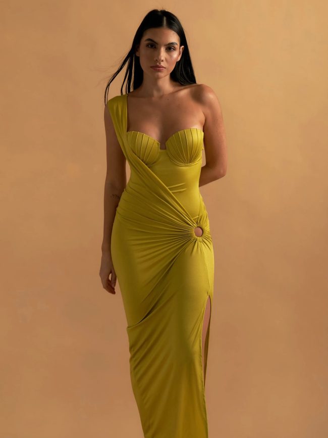 Modern olive one-shoulder swimsuit with geometric print paired with a flowing sheer maxi sarong for an elegant resort look.