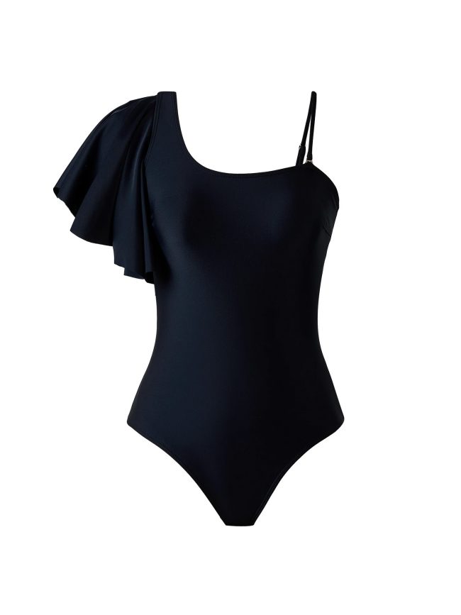 A sleek black one-piece swimsuit paired with a minimalist skirt for timeless elegance.