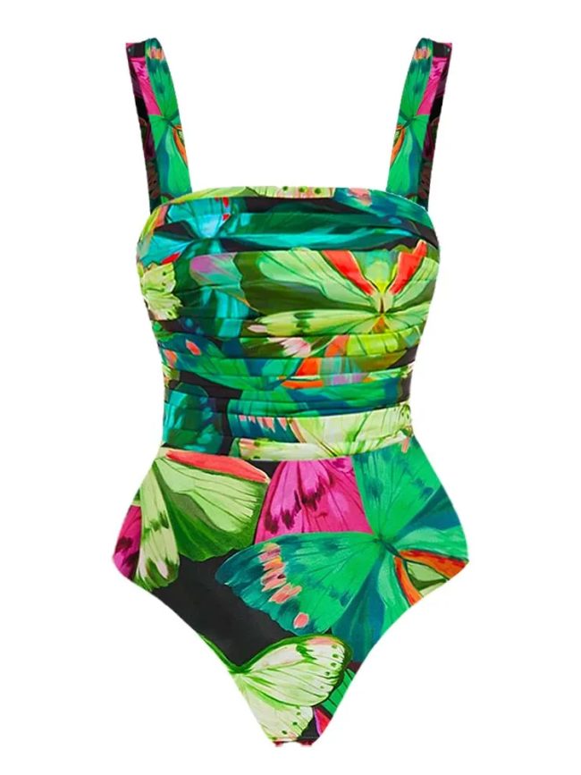 A vibrant butterfly-inspired one-piece paired with a flowing maxi skirt for bold summer elegance.
