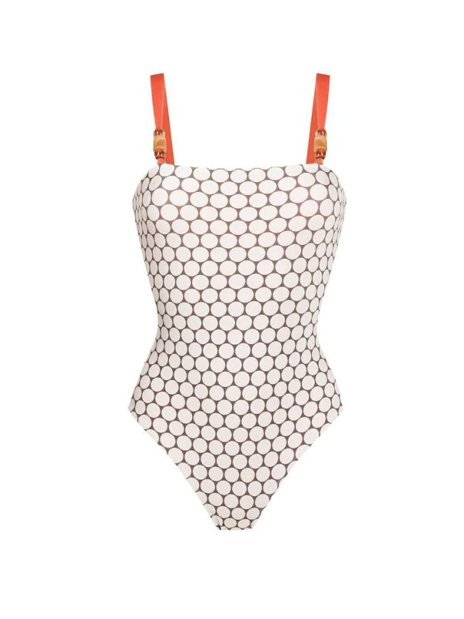 Mocha polka dot one-piece featuring contrast terracotta straps and a sculpting silhouette. A timeless retro-inspired design with modern resort elegance.