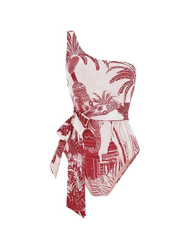 A refined one-shoulder swimsuit paired with a matching sarong, featuring an artistic red toile print for a bold yet elegant resort statement.