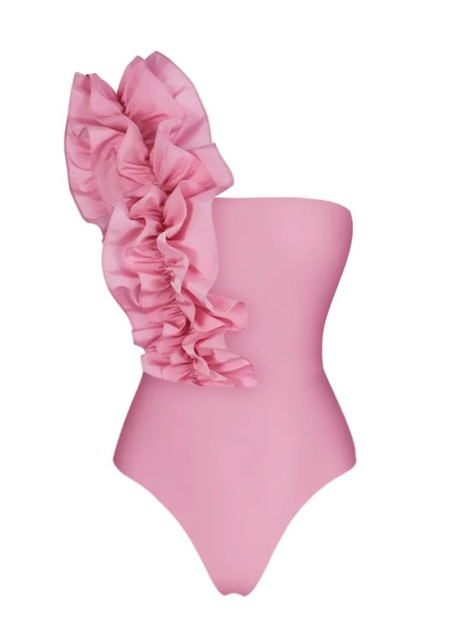 A soft pink one-shoulder swimsuit with sculptural ruffles, paired with a flowing maxi skirt for elegant summer romance.