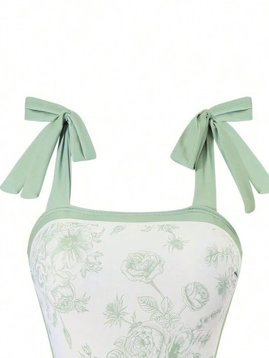 Soft sage floral one-piece swimsuit with delicate bow straps, paired with a flowing wrap sarong for a graceful Mediterranean resort look.