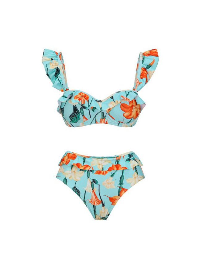 Vibrant floral bikini with romantic ruffled straps and high-waisted bottoms, paired with a flowing wrap sarong for a bold resort look.