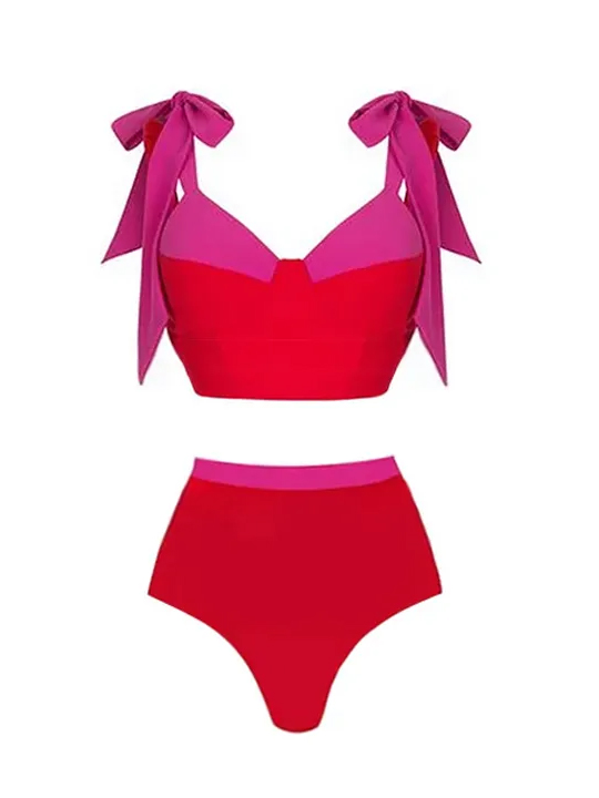 A bold red and pink bikini with feminine bow straps, paired with a sleek matching skirt.