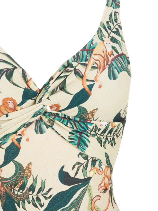 Elegant tropical jungle-print one-piece swimsuit paired with a flowing wrap sarong for a refined resort-ready look.