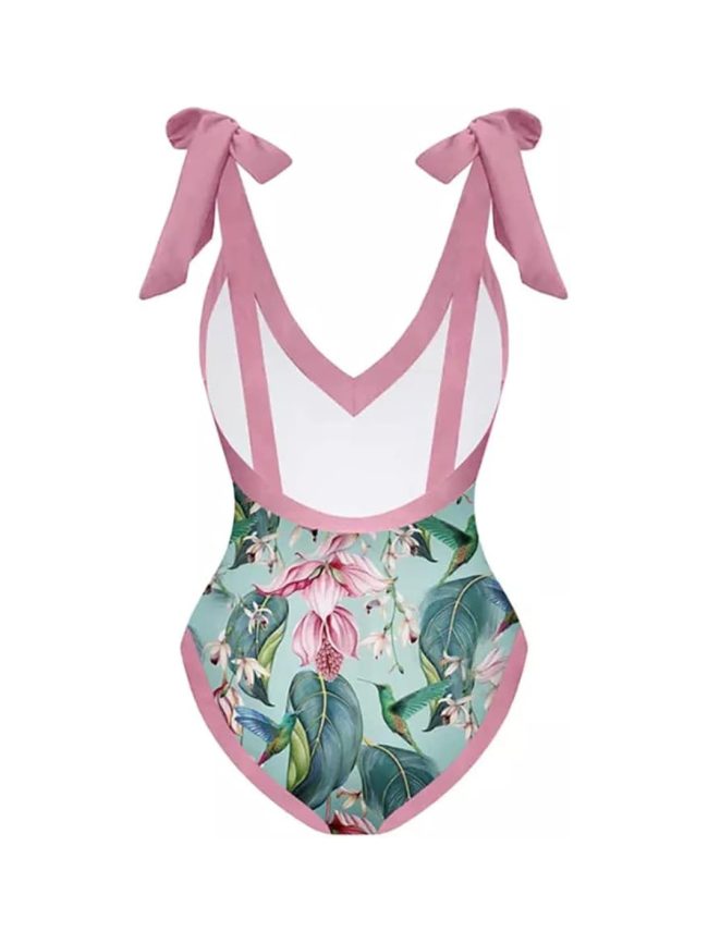 Elegant tropical floral one-piece swimsuit with pink tie straps paired with a flowing wrap sarong for a soft feminine resort look.
