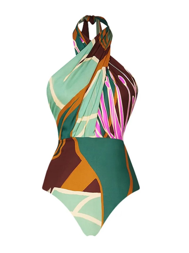 The sculpted halter-neck swimsuit features a striking abstract print in deep green, warm brown, soft mint, and delicate pink accents, creating a powerful yet refined visual balance.