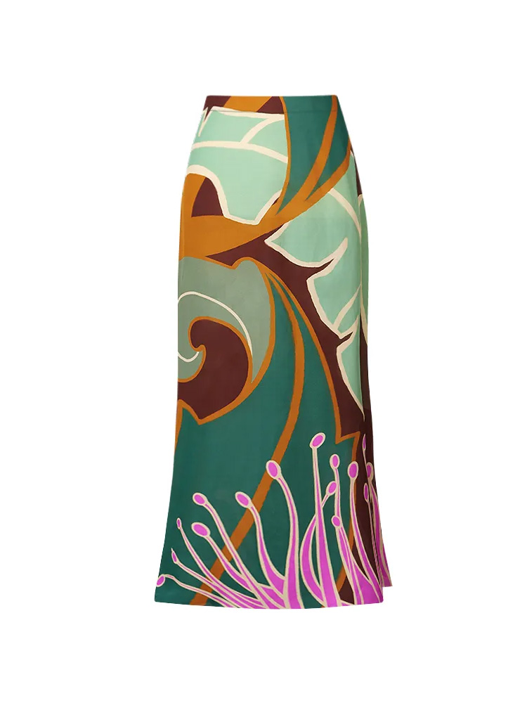 The matching midi skirt flows effortlessly, elongating the silhouette and transforming the look from beachwear to elevated resort styling. Perfect for poolside lounges, gallery-like beach clubs, and statement summer moments.