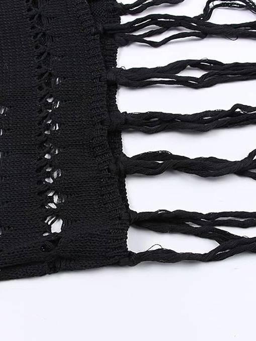 Crafted from lightweight, breathable knit fabric, it gently contours the body while allowing fluid movement and comfort. The deep V neckline creates a striking and feminine shape, while the adjustable waist tie defines the silhouette with a soft, flattering fit. The skirt features subtle openwork detailing and a side slit for movement, finished with fringe accents that add texture and dynamic flow.