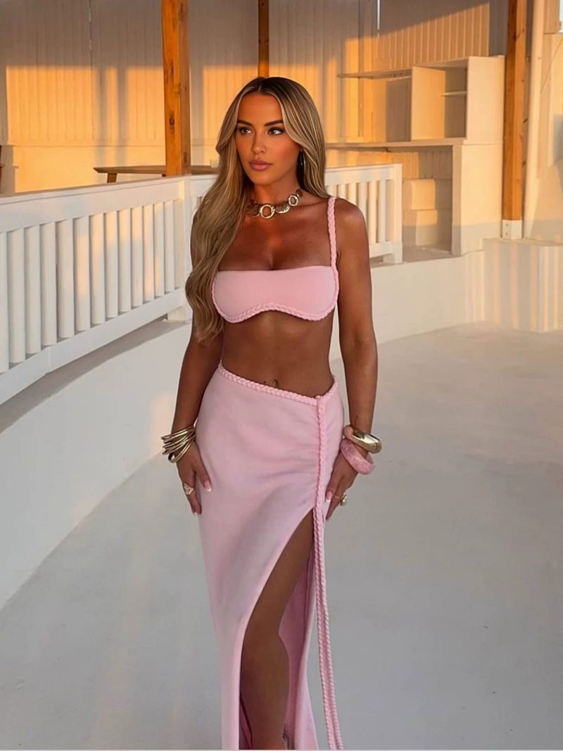 Completing the ensemble is a flowing wrap skirt designed in the same blush shade and finished with a braided edge detail that mirrors the bikini design. The high slit adds movement and elegance while elongating the silhouette, making the look perfect for beach clubs, seaside dinners, and sunset walks.