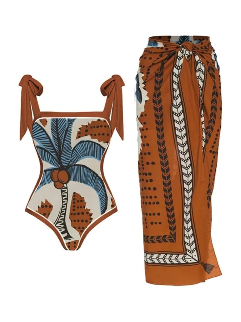 Bohemian-inspired palm print one-piece swimsuit with tie shoulder straps paired with a coordinated wrap sarong for a bold resort statement.