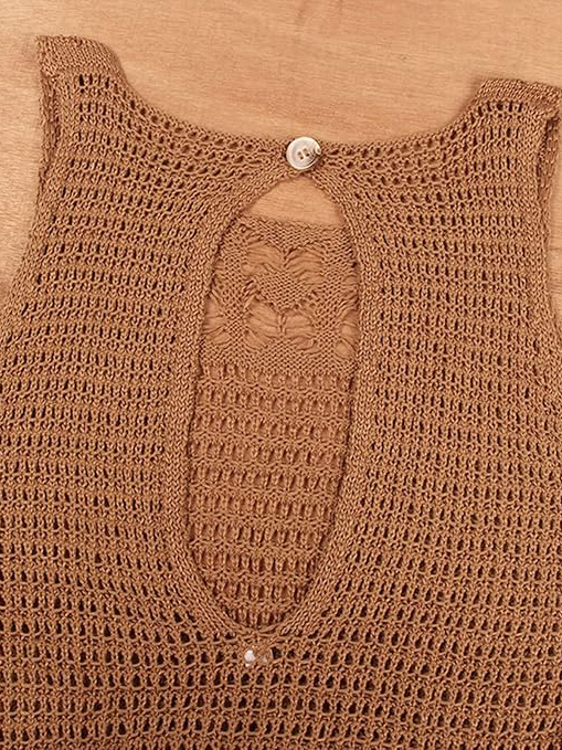 Featuring detailed crochet craftsmanship, it hugs the body while remaining lightweight and breathable. The sleeveless design and adjustable waist tie create a flattering silhouette, while the side slit and fringe hem add fluid movement and a touch of bold femininity.