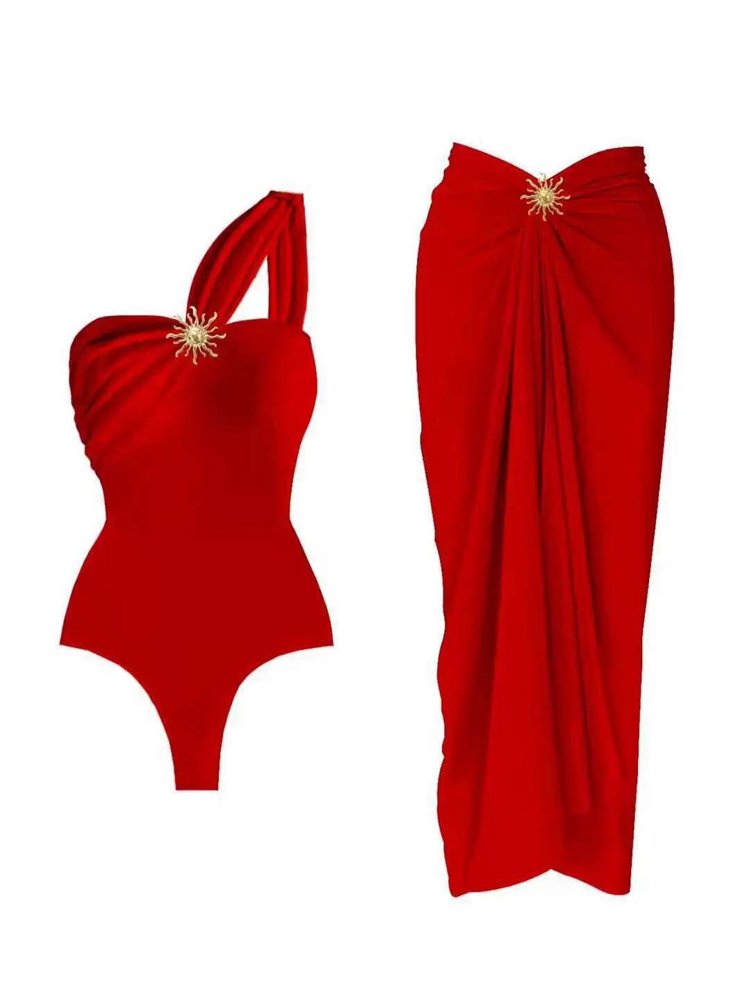 A bold crimson one-shoulder swimsuit paired with a flowing wrap skirt, finished with a radiant gold sun detail.