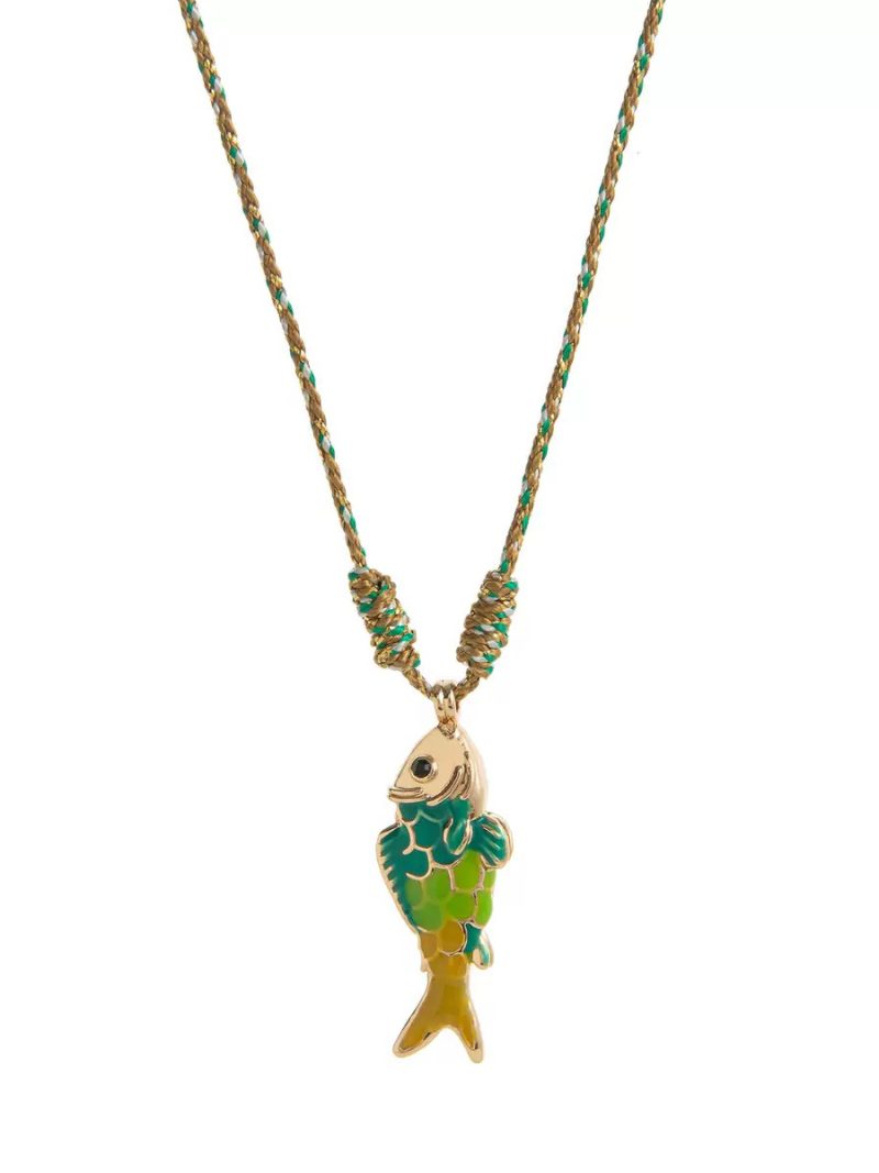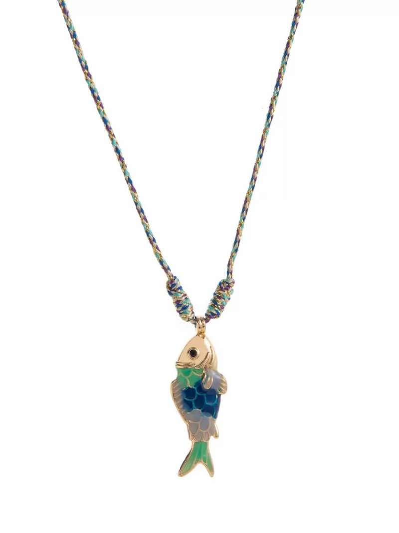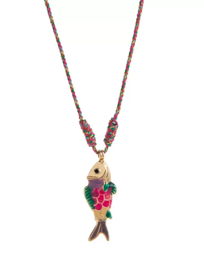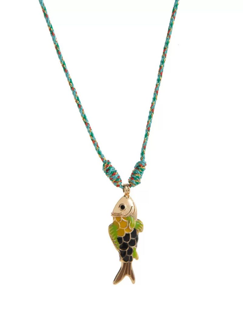 Designed with a twisted rope in natural tones accented with hints of green, this necklace features a vibrant enamel fish pendant as its centerpiece. The playful mix of colors adds a lively touch while maintaining a clean, minimal aesthetic.