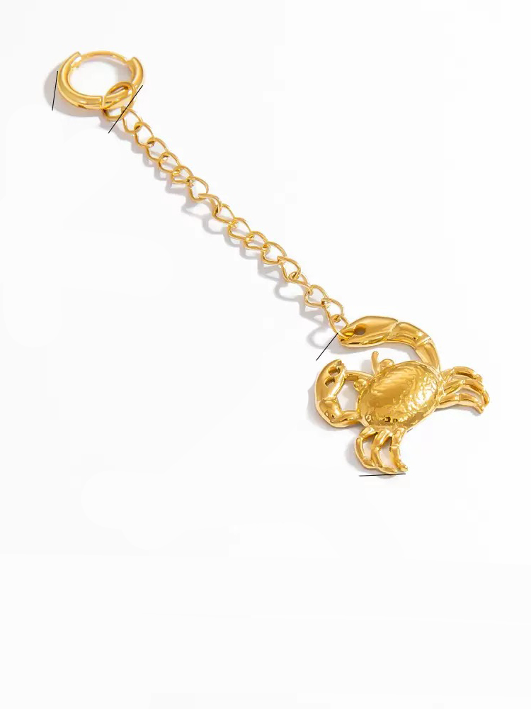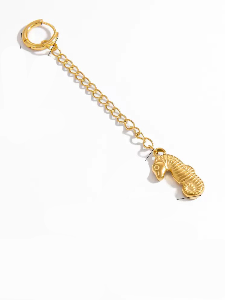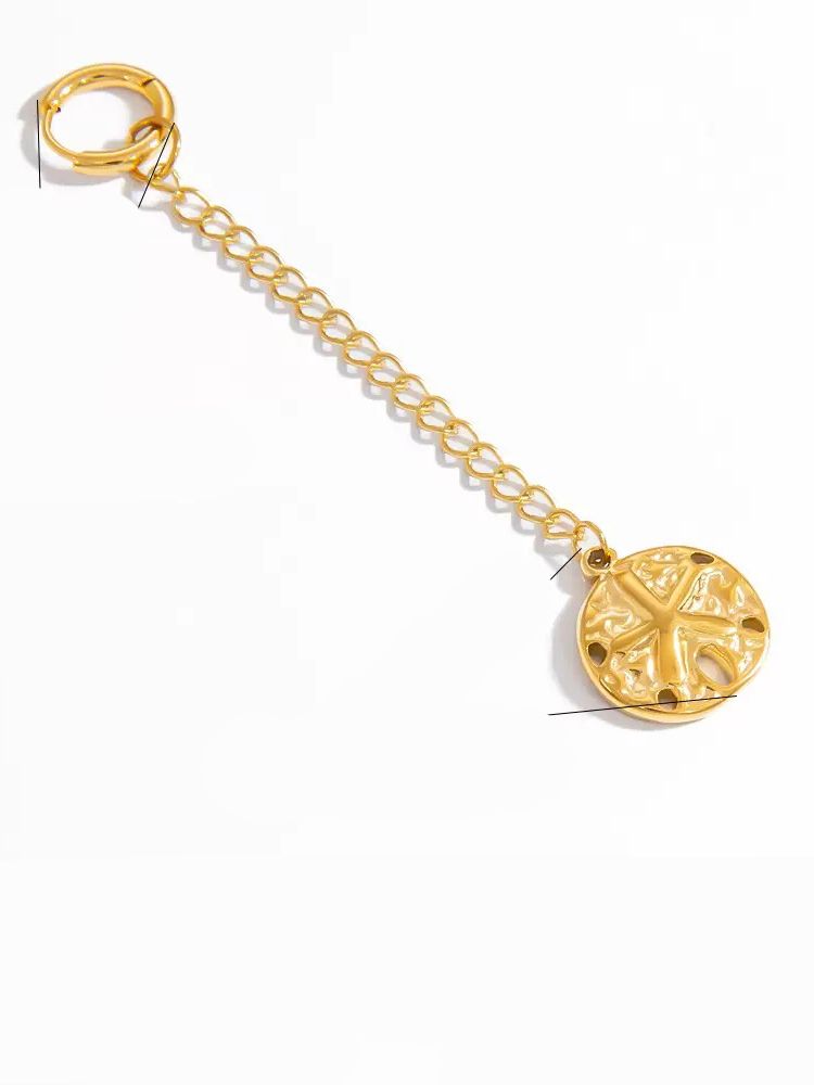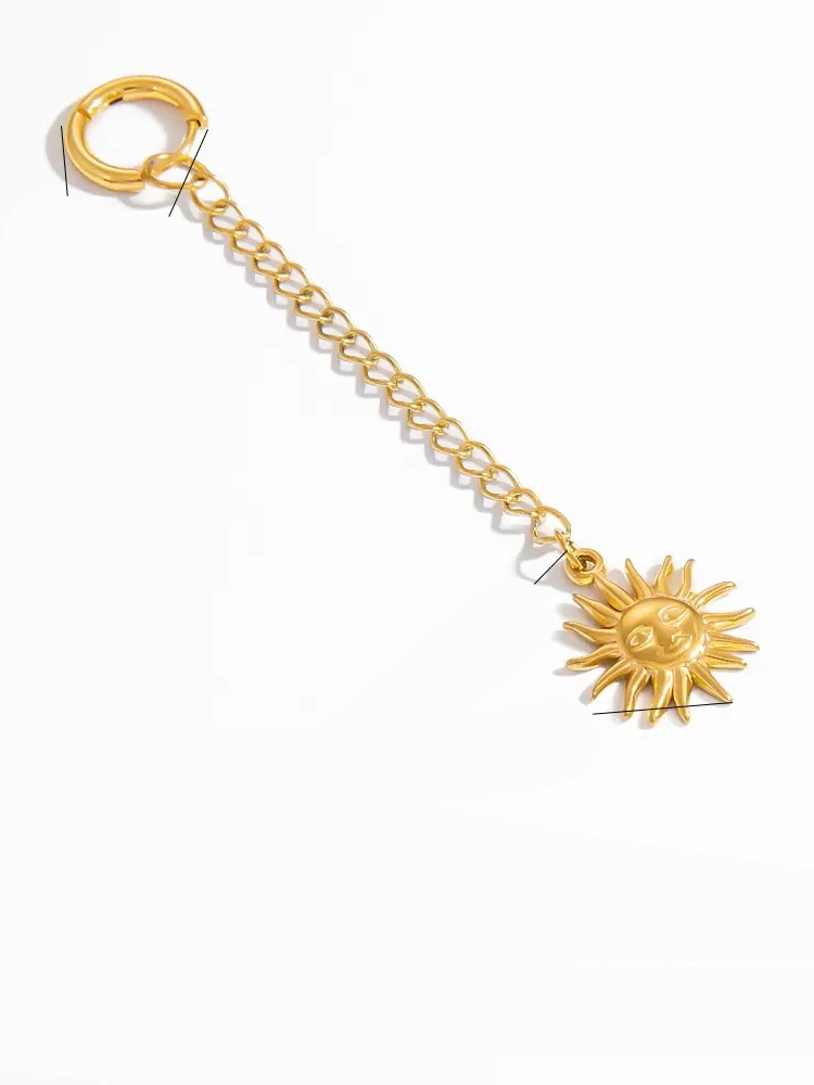 Featuring a structured gold-tone clip, this piece is adorned with three hanging charms including a palm motif, geometric detail, and a circular medallion. The fine chains create soft movement, catching the light with every step.