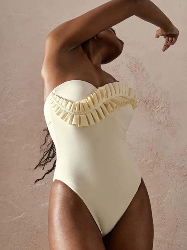 Timeless, feminine, and effortlessly elegant, the Ivory Ruffle one-piece swimsuit is designed to make a refined statement at the beach or poolside. Crafted in a soft ivory tone, the minimalist silhouette is elevated by a striking oversized ruffle that flows diagonally across the neckline and shoulder.