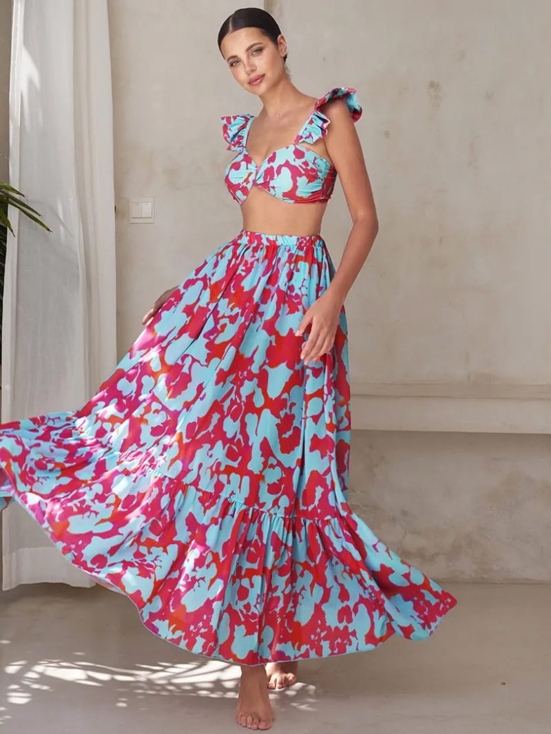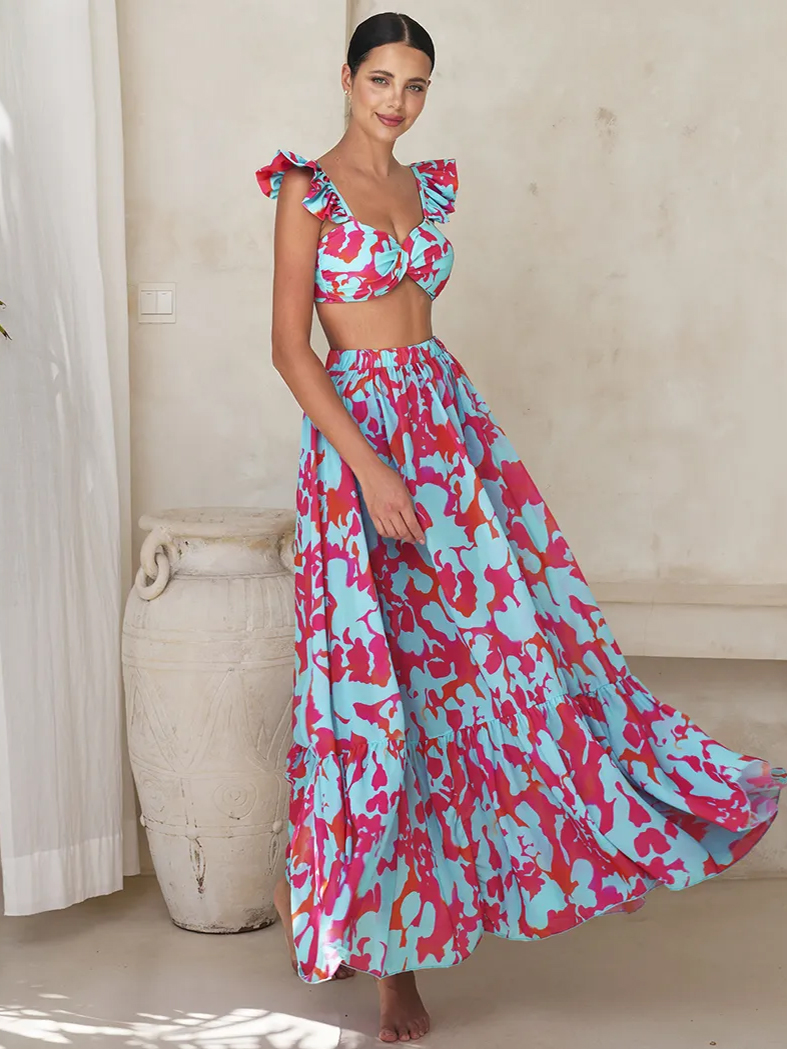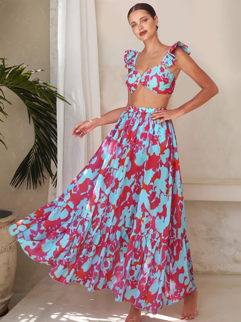 A vibrant bikini paired with a flowing maxi skirt for a playful, sun-drenched resort look.