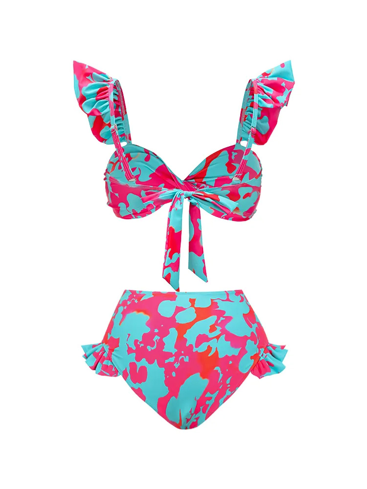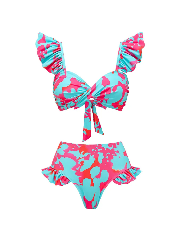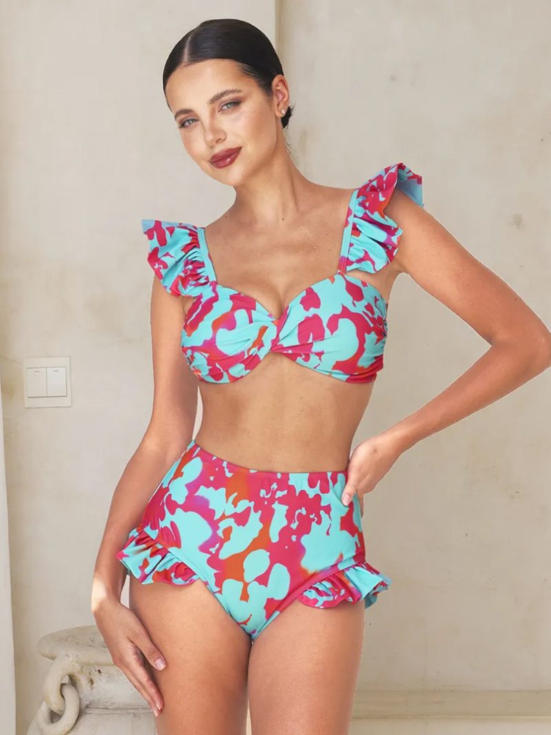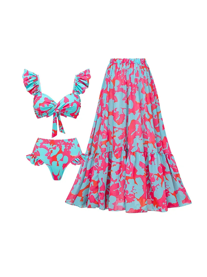 The bikini features a supportive, feminine top with soft ruffle straps and a flattering high-waist bottom, while the matching long skirt adds movement and effortless elegance.