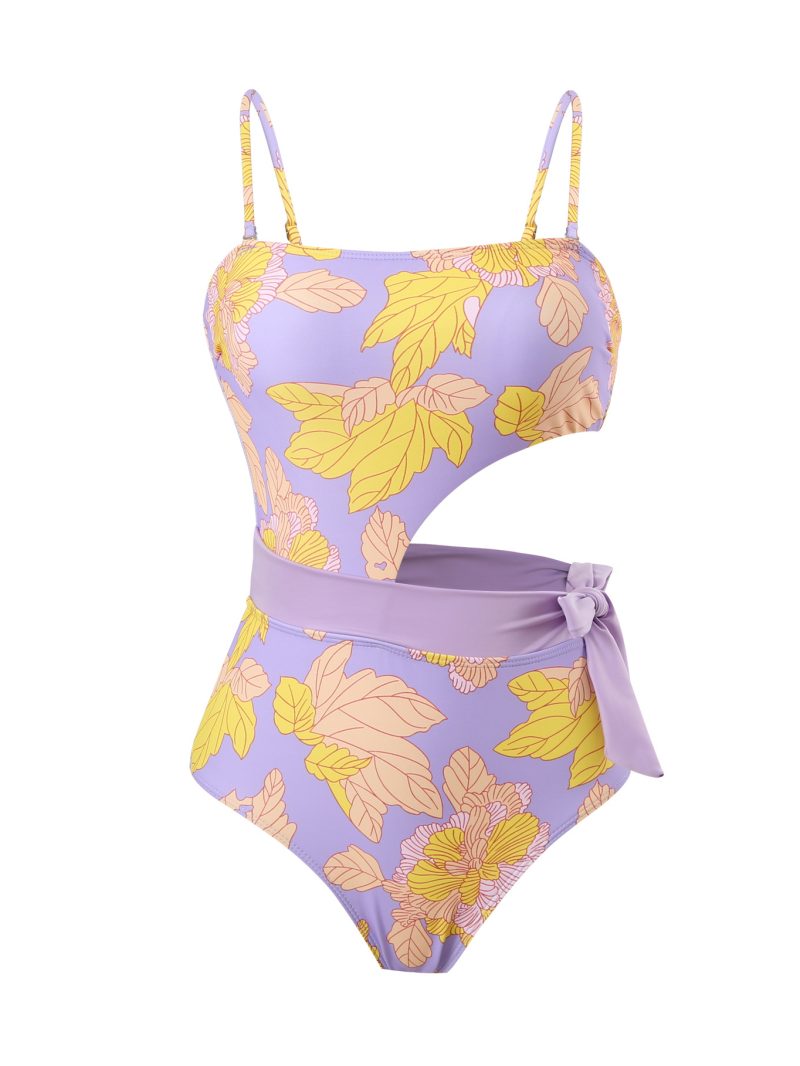 The one-piece swimsuit features delicate straps and a sculpting side cut-out that highlights the waist while maintaining a soft, feminine silhouette. The pastel lilac base is elevated with warm yellow floral motifs, creating a fresh and joyful Mediterranean feel.