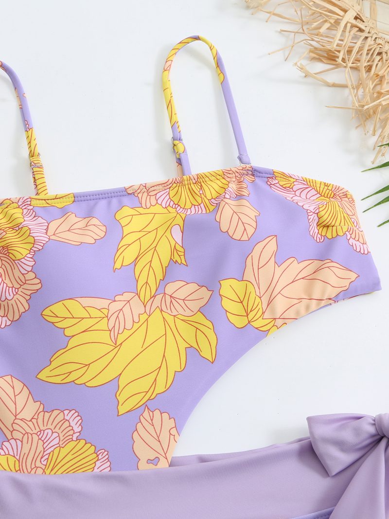 A lilac floral cut-out one-piece paired with a matching sheer sarong.