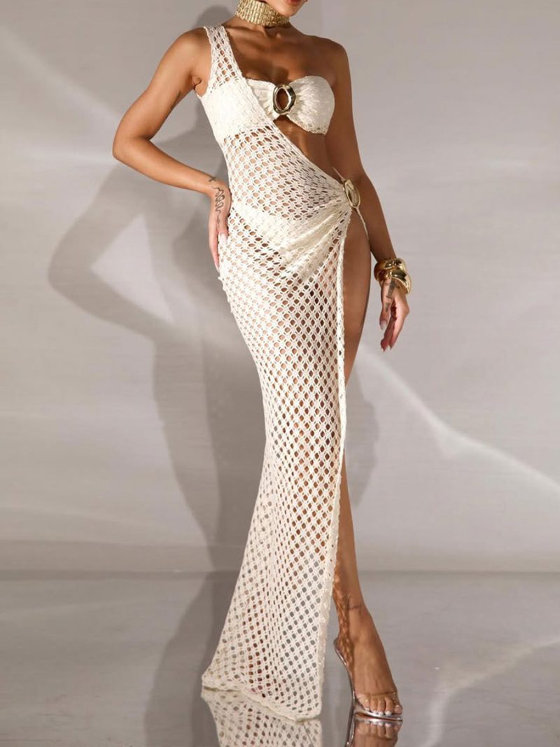 The Mesh Sand One-Piece is a bold expression of effortless beach glamour. Crafted in soft open-knit mesh, this statement design features an asymmetrical one-shoulder cut and a high-slit draped skirt effect that moves fluidly with the body.
