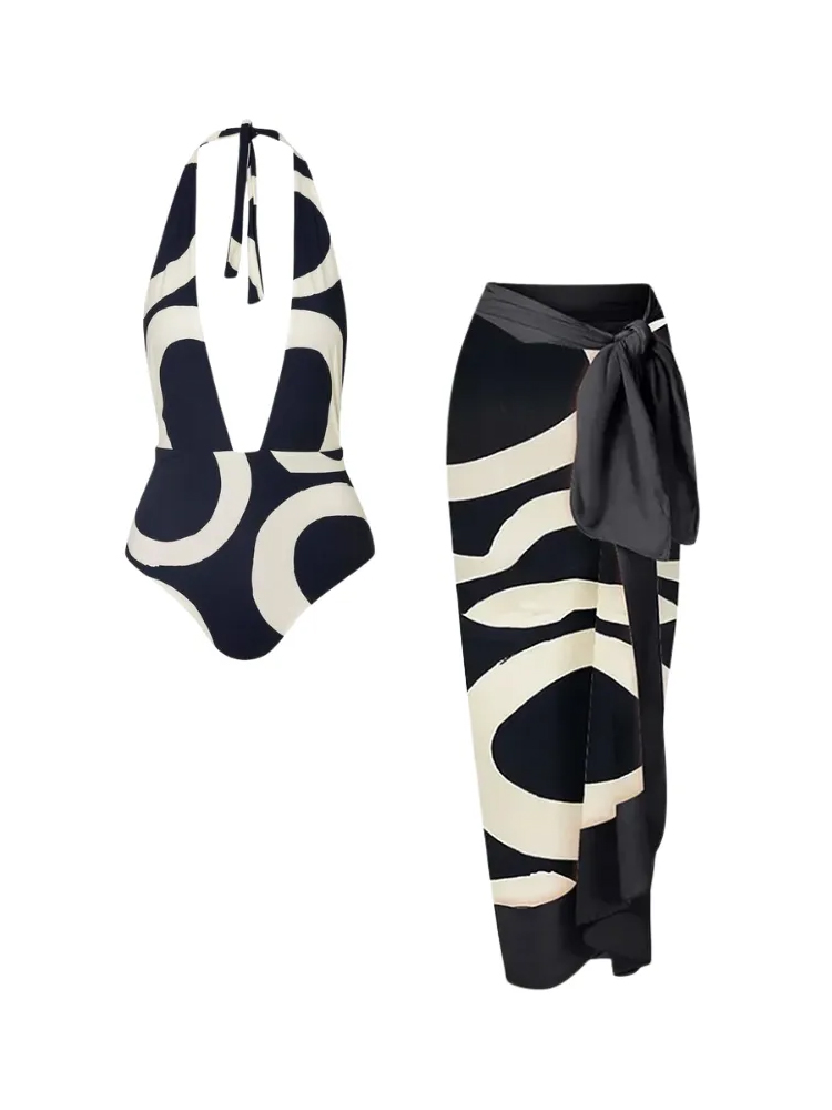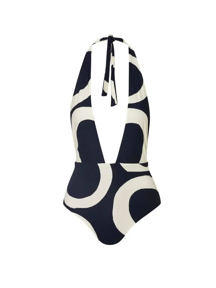Black halter one-piece featuring bold ivory wave print and a deep open back. Modern, sculptural, and effortlessly refined.