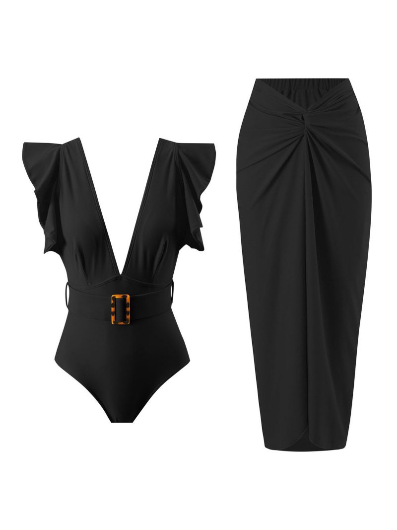 The Noir Buckle One-Piece Swimsuit & Wrap Skirt Set is a refined expression of modern elegance. Designed in timeless black, the one-piece features a deep V neckline with soft ruffled shoulders and a structured waist accentuated by a tortoiseshell-effect buckle — sculpting the silhouette with subtle drama.