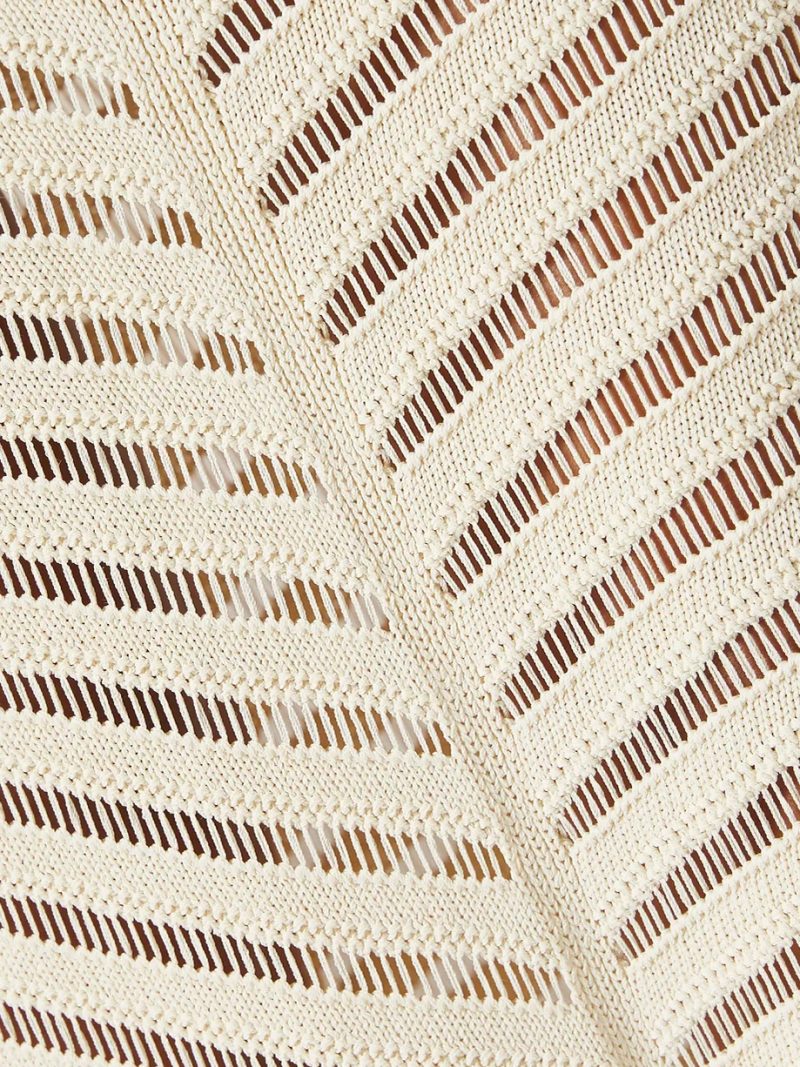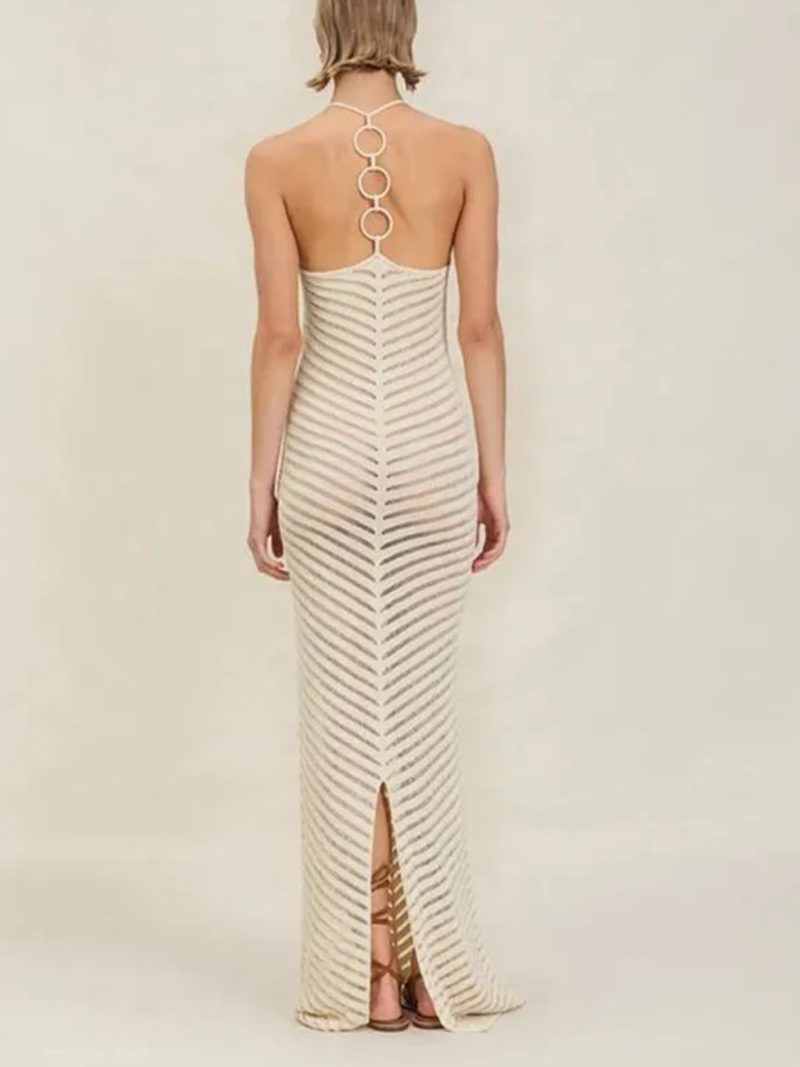 Elegant off-white knit maxi dress with a sleek silhouette and breathable texture for refined summer styling.