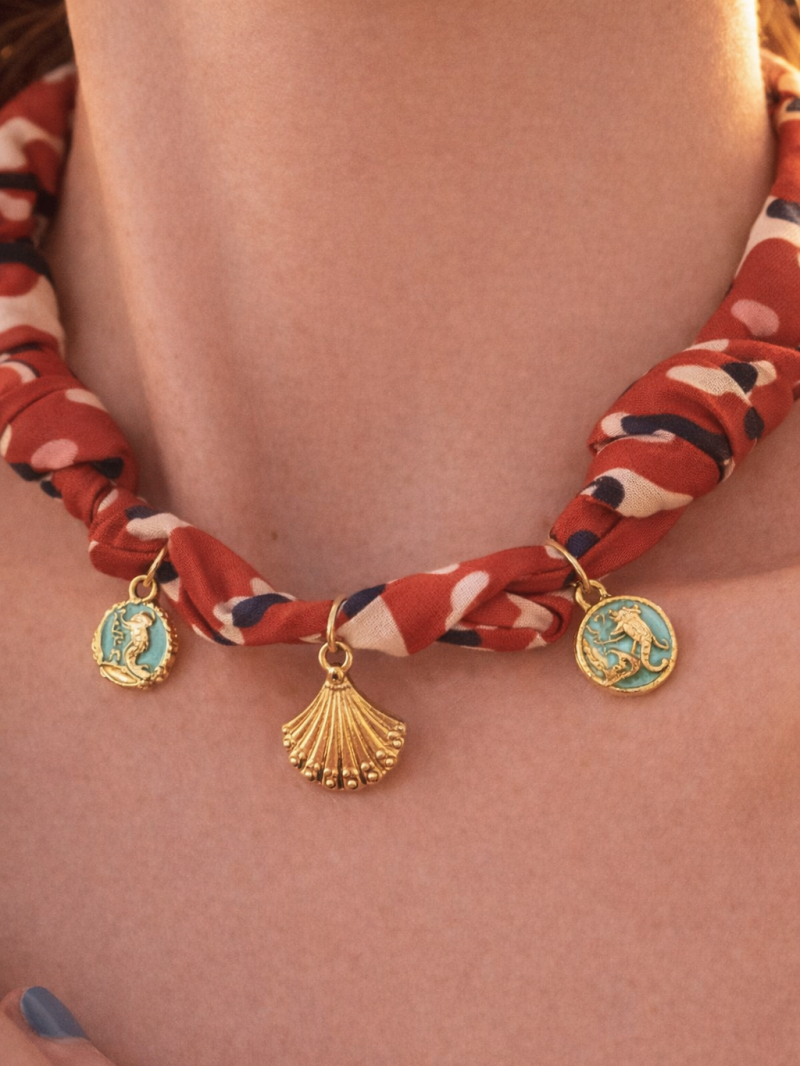 Floral scarf necklace with gold sea charms, adding a warm and elegant summer touch.