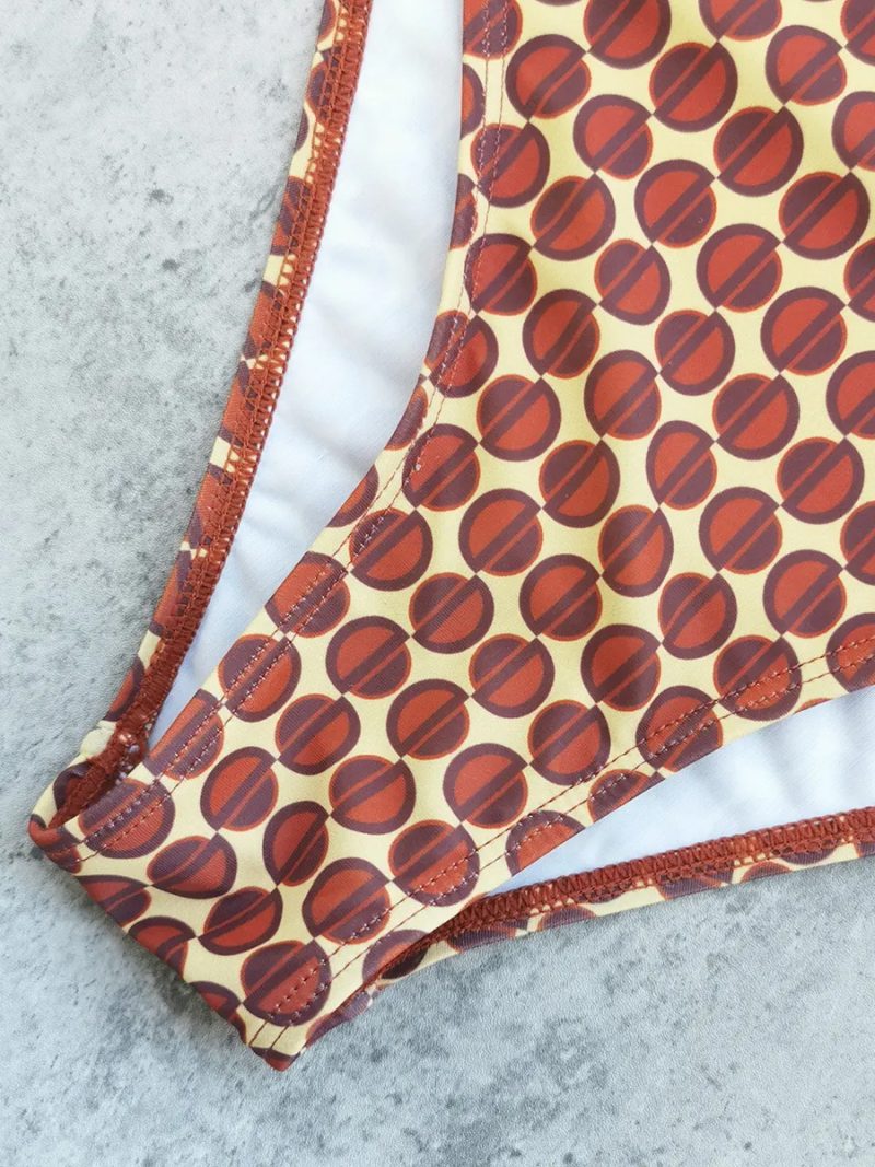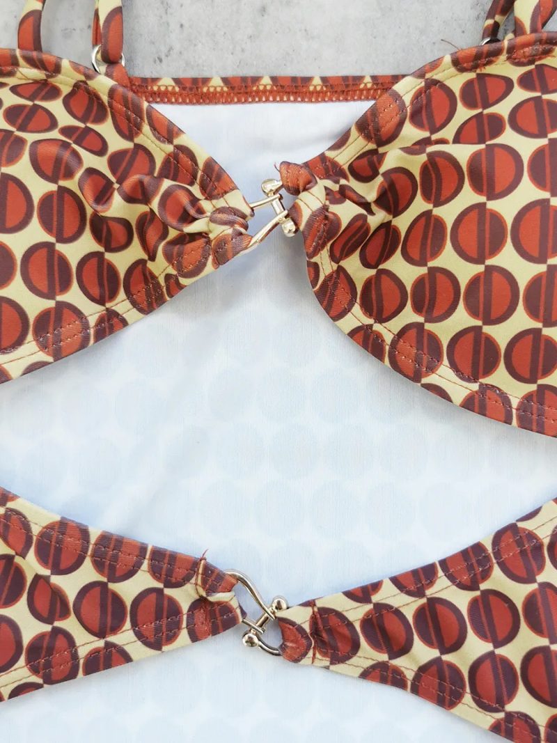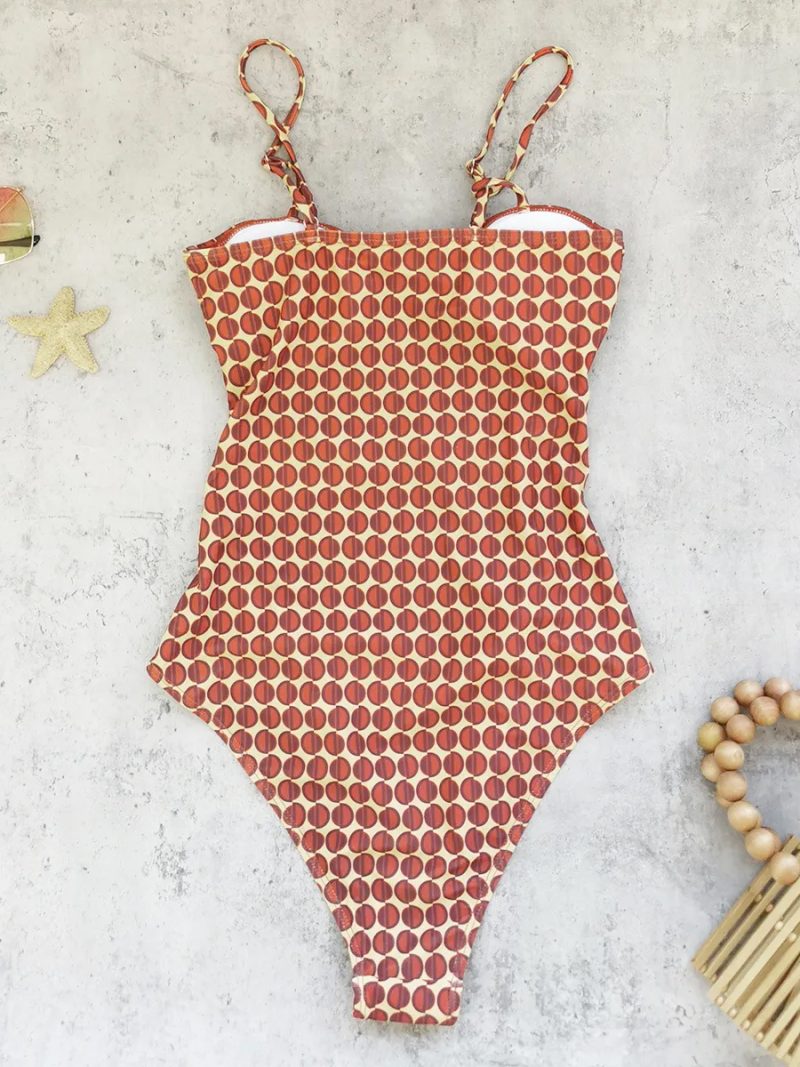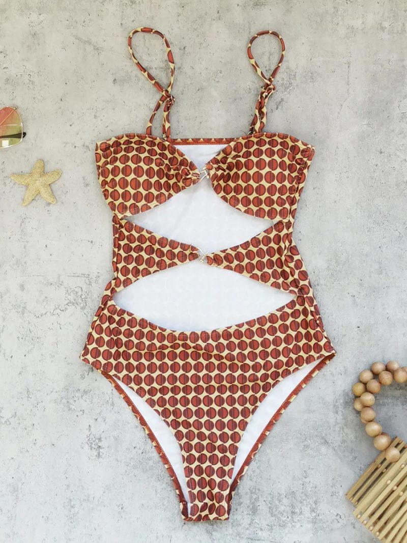Mocha geometric print one-piece featuring sculpted cut-outs and delicate ring accents. Bold, flattering, and effortlessly statement-making.