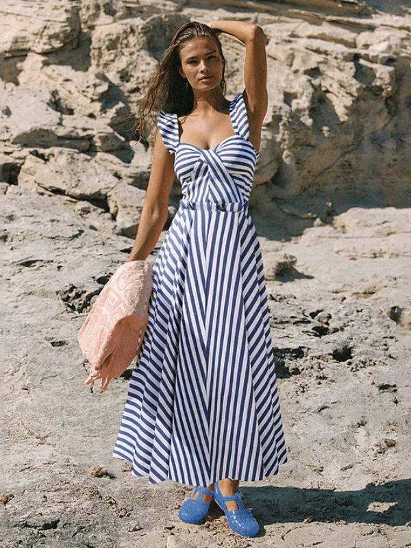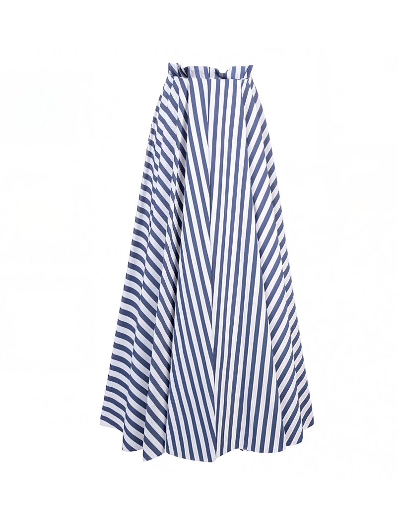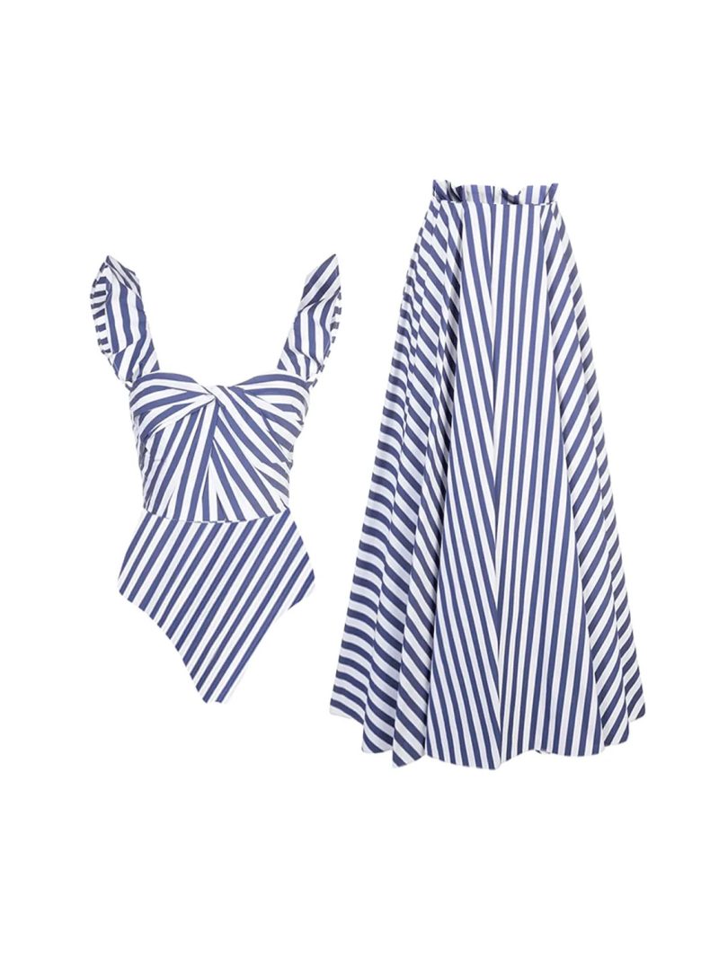 A blue-and-white striped one-piece swimsuit paired with a flowing matching skirt for timeless coastal style.