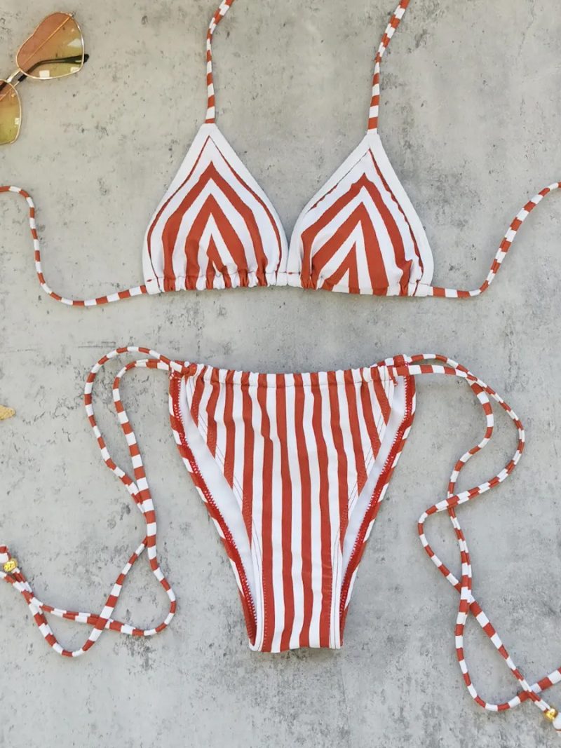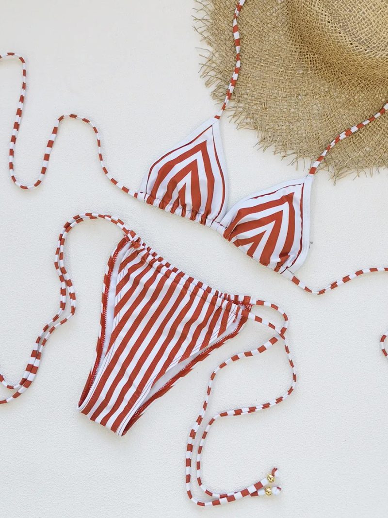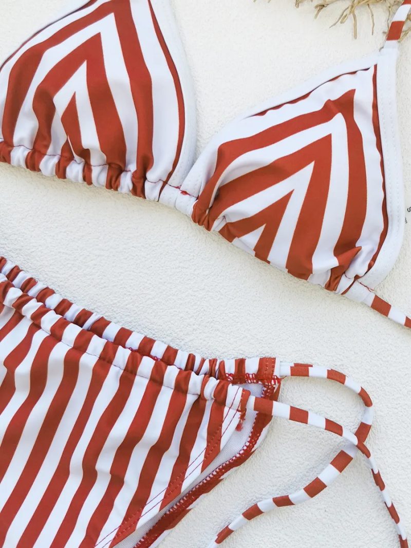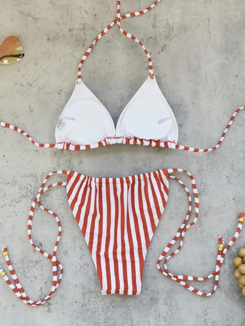 Red and white striped triangle bikini with adjustable string ties. Playful, flattering, and inspired by classic Mediterranean summers.