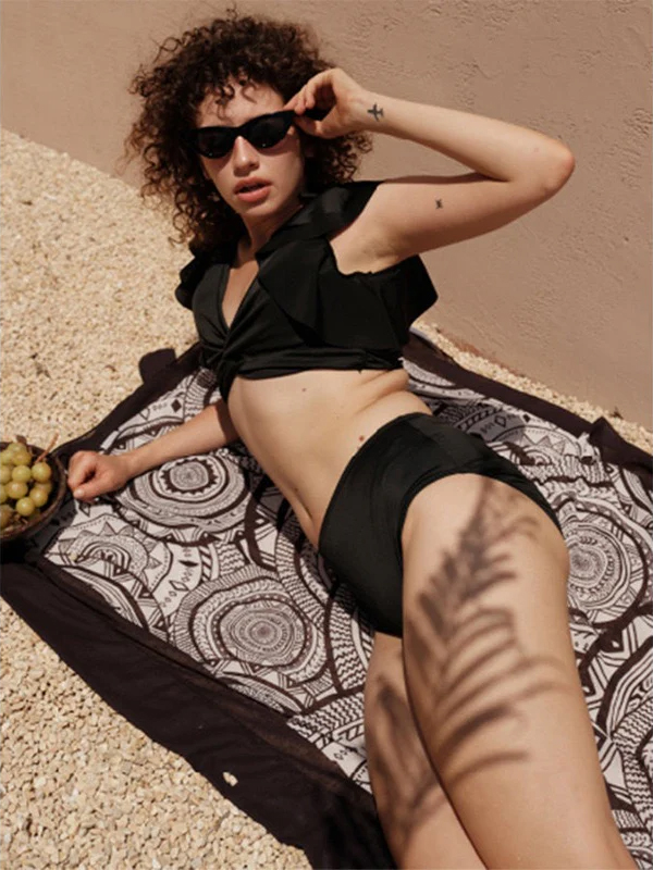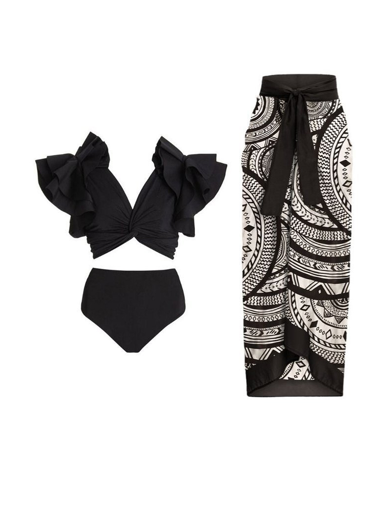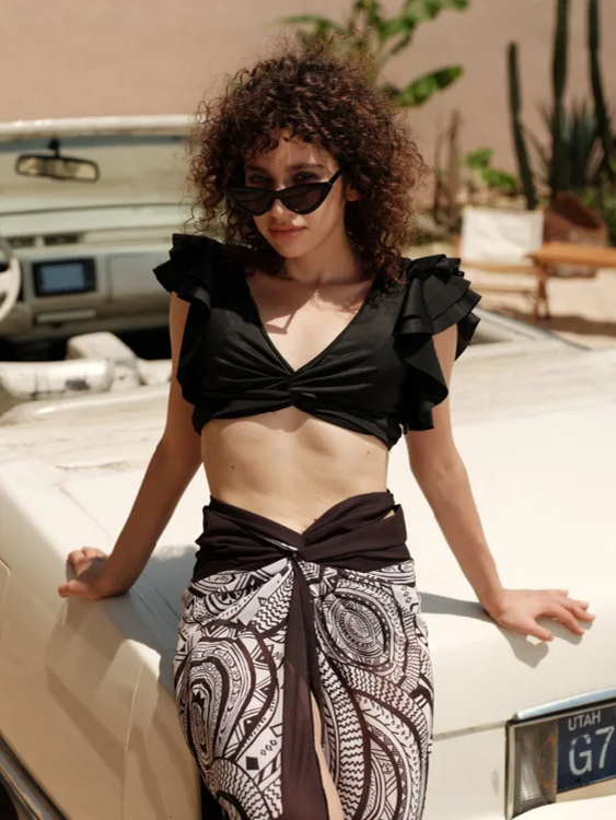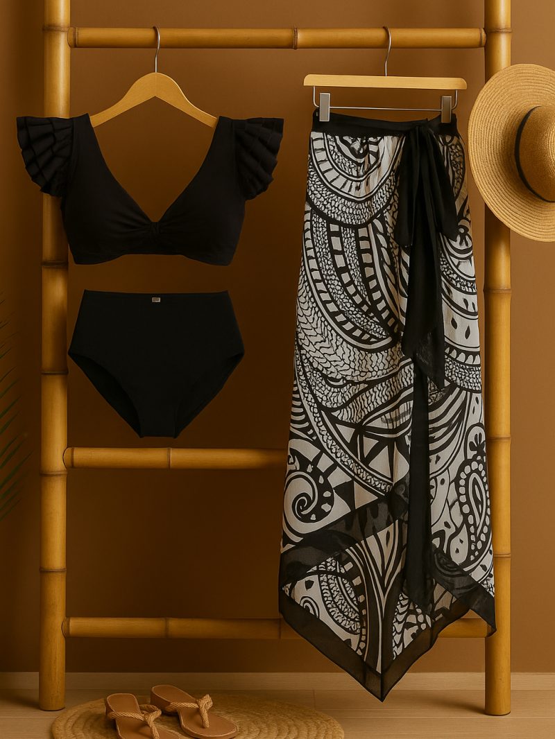 The Ruffle Black Bikini Set with Tribal Wrap Skirt is designed for women who embrace confidence and contrast. The bikini top features dramatic ruffled sleeves that frame the shoulders beautifully, adding volume and elegance to a minimalist black silhouette.