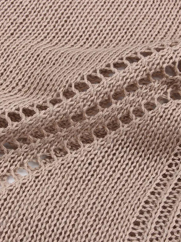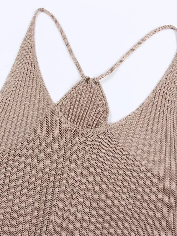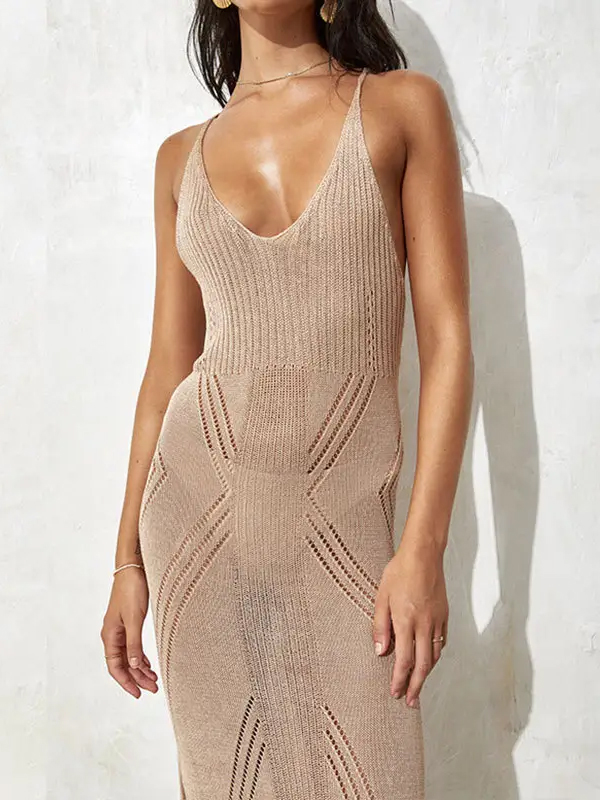 Soft sand-toned knit maxi dress with a fluid silhouette and refined texture inspired by coastal tones.