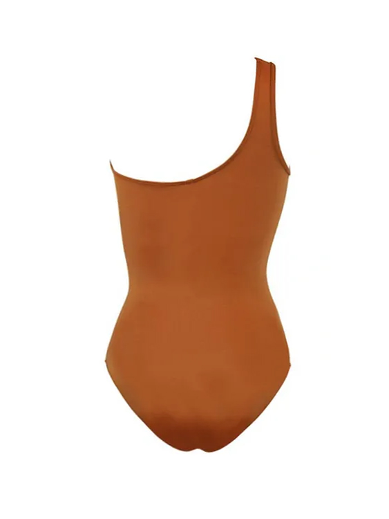 A sculptural one-shoulder swimsuit in warm terracotta tones, paired with an artistic wrap sarong.