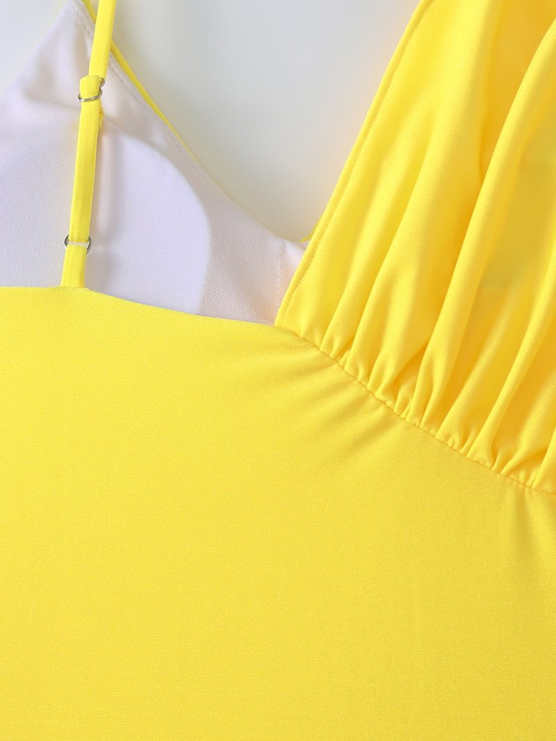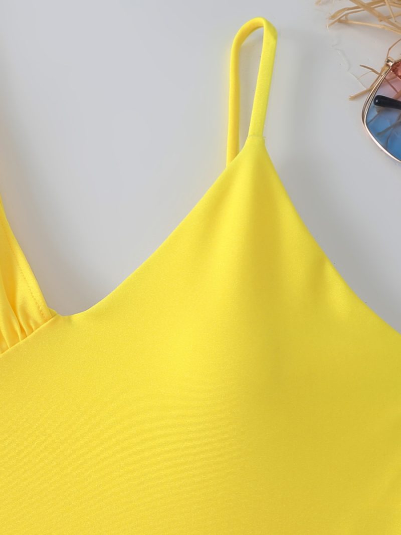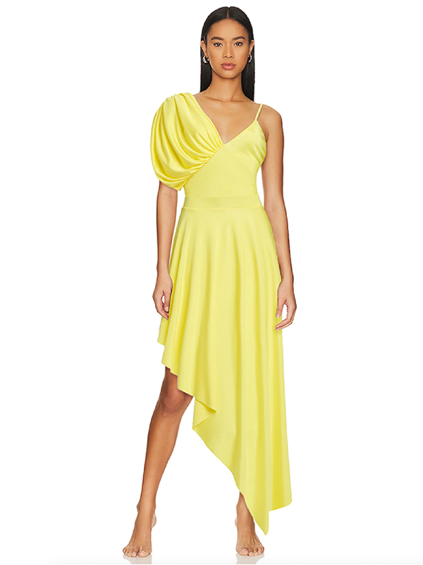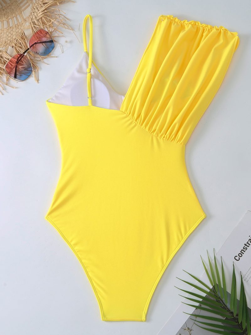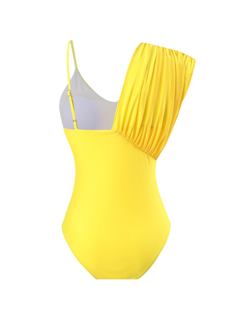 The sculpting one-piece features an elegant asymmetric neckline with soft gathered detailing on one shoulder, creating a flattering, modern silhouette. Its radiant yellow hue instantly elevates sun-kissed skin.