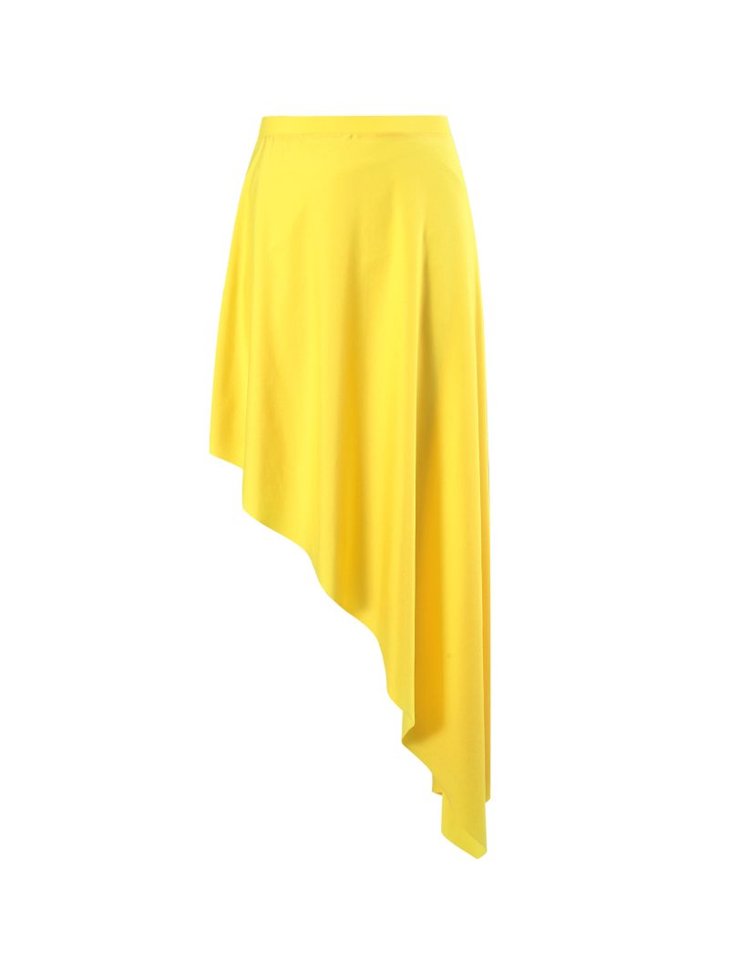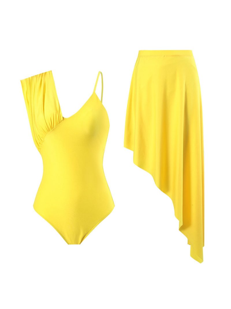 A vibrant yellow one-shoulder swimsuit paired with a flowing asymmetrical skirt for effortless summer glamour.