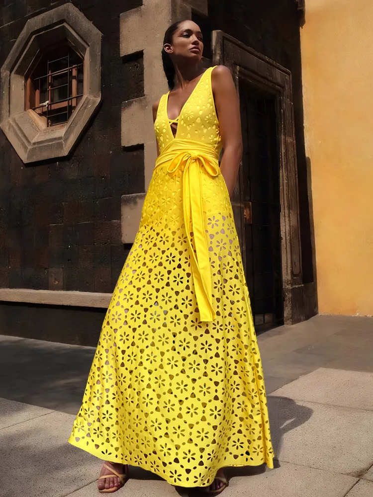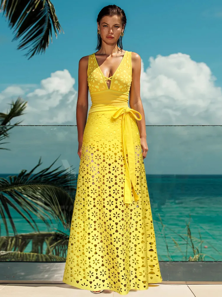 Paired with a flowing sarong crafted in the same embroidered pattern, this set transitions seamlessly from poolside glamour to beachside dining. The coordinated textures and sunny yellow tone evoke warmth, confidence, and timeless resort style.