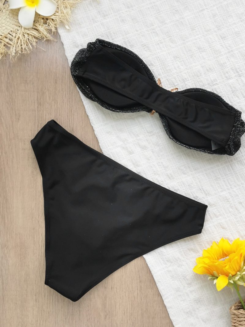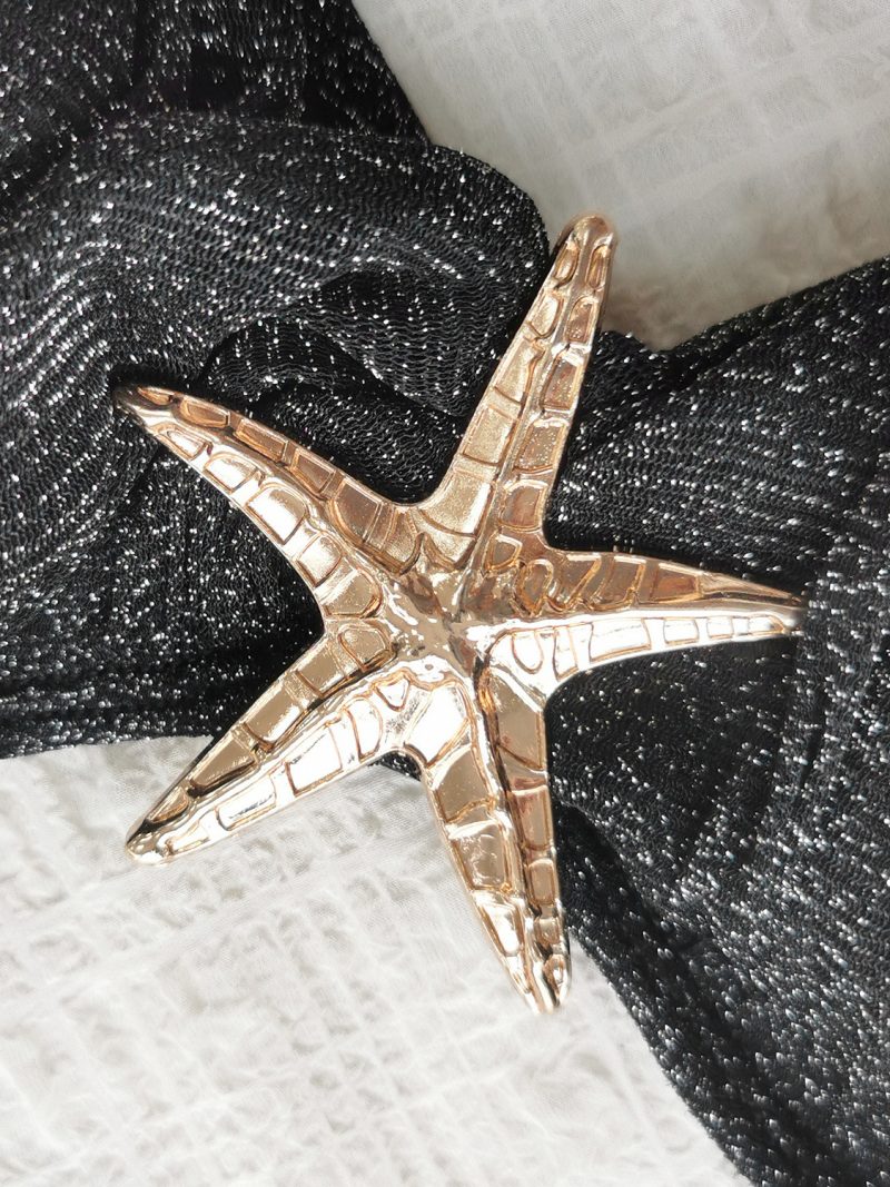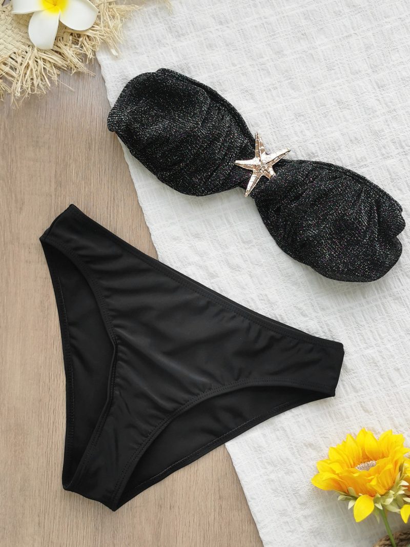 The Star Noir set brings effortless glamour to the shoreline. Designed with a softly textured bandeau bikini top adorned with a metallic starfish centerpiece, this look balances minimal elegance with statement detail.