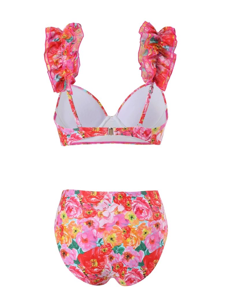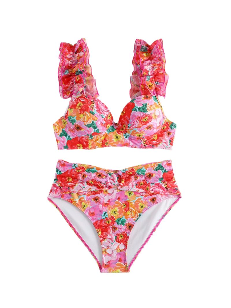 Vibrant floral bikini with romantic ruffled straps and high-waisted bottoms, paired with a flowing wrap sarong for a bold resort look.