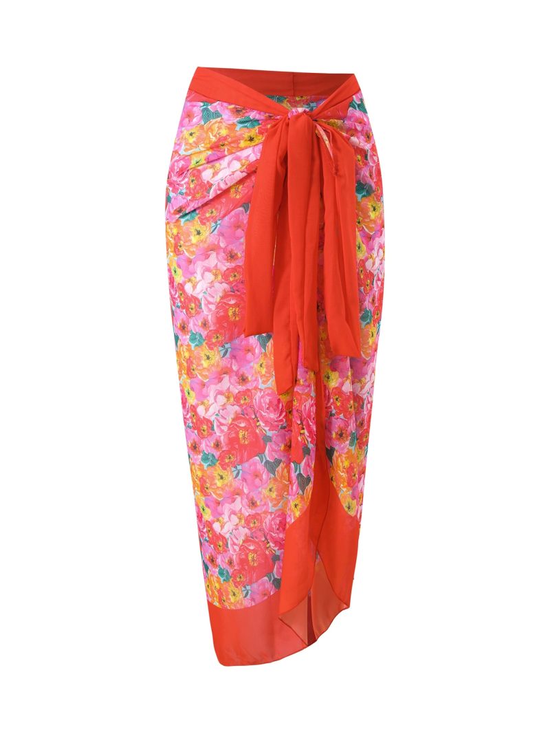 Completing the look is a coordinating wrap sarong in the same vivid floral print, finished with a bold coral waist tie that adds contrast and elegance. The lightweight fabric drapes beautifully and moves effortlessly, making it perfect for beachside lounging, poolside afternoons, or sunset walks by the sea.